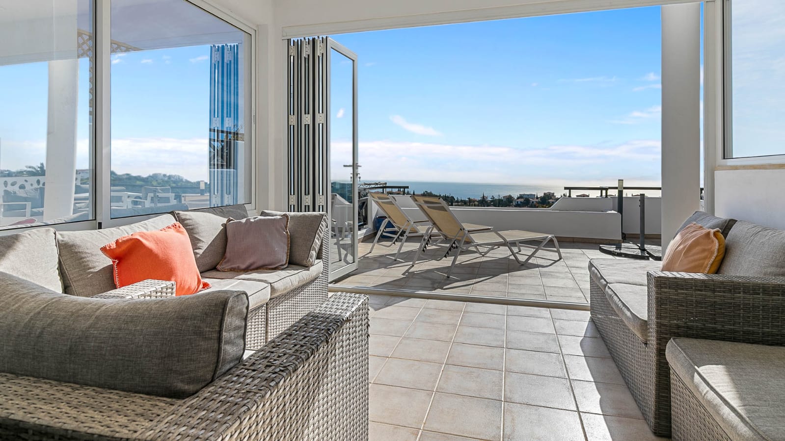 The apartment is designed around light and flow. Large sliding doors open the living space directly onto the terrace and sunroom, allowing the Mediterranean landscape to become part of the interior.