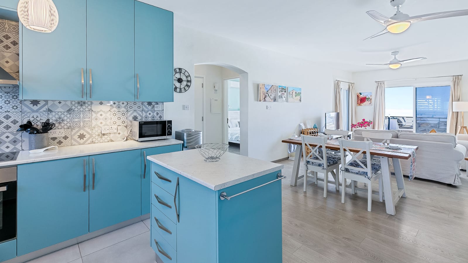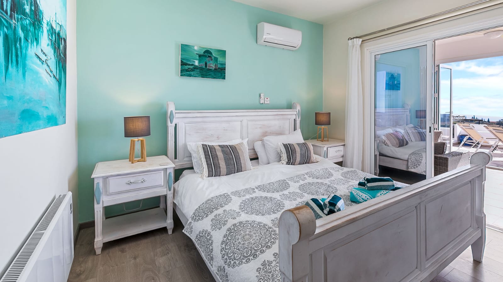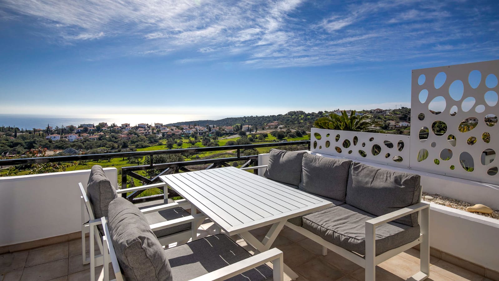 Perched above the village of Pissouri, Thea Vista is an elegant two-bedroom apartment offering uninterrupted views across the valley and out to the Mediterranean Sea. The setting is peaceful, private and beautifully open — an ideal retreat for those seeking space, light and calm.